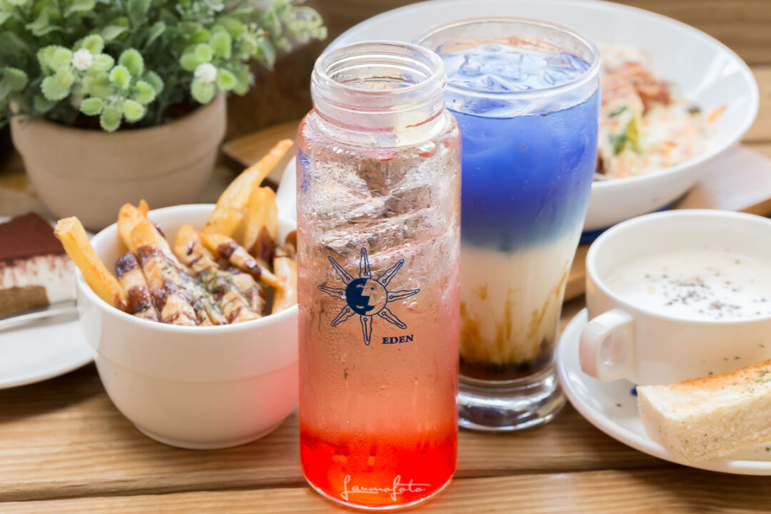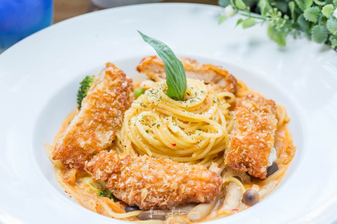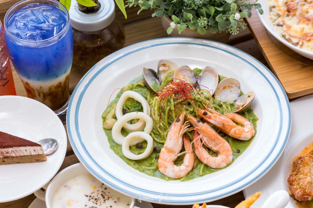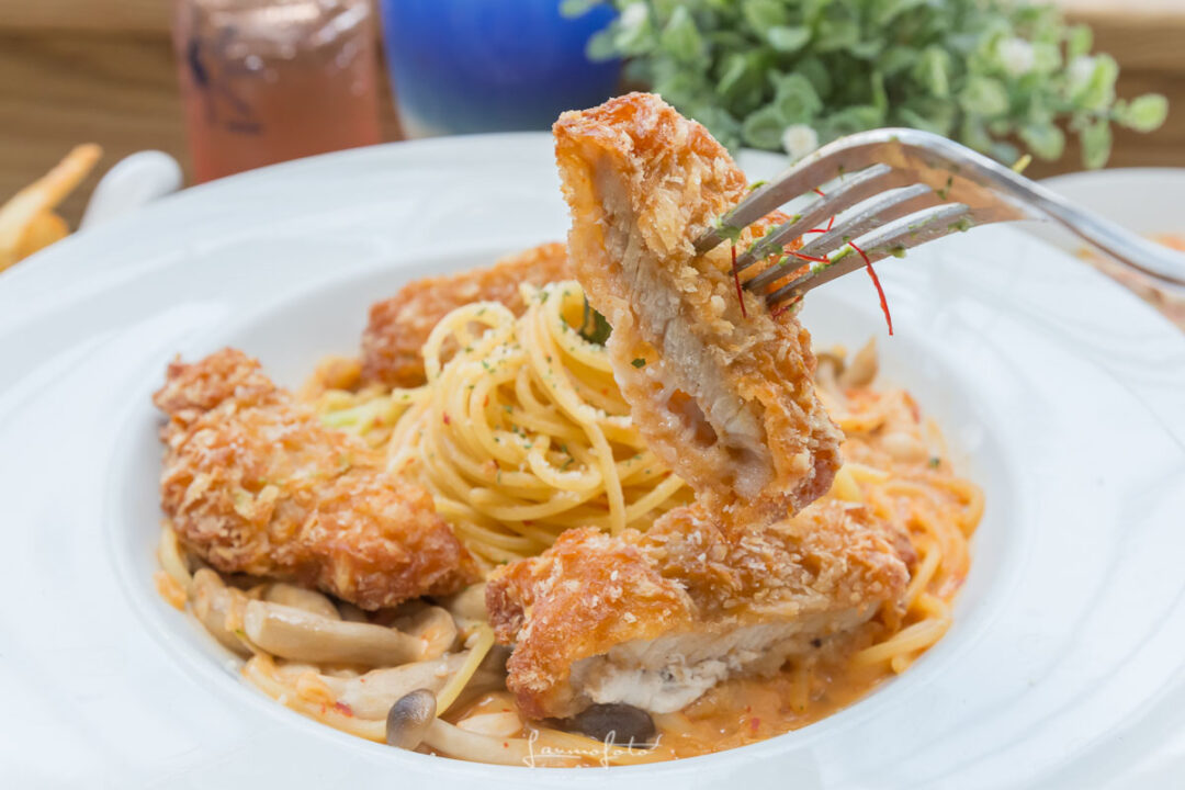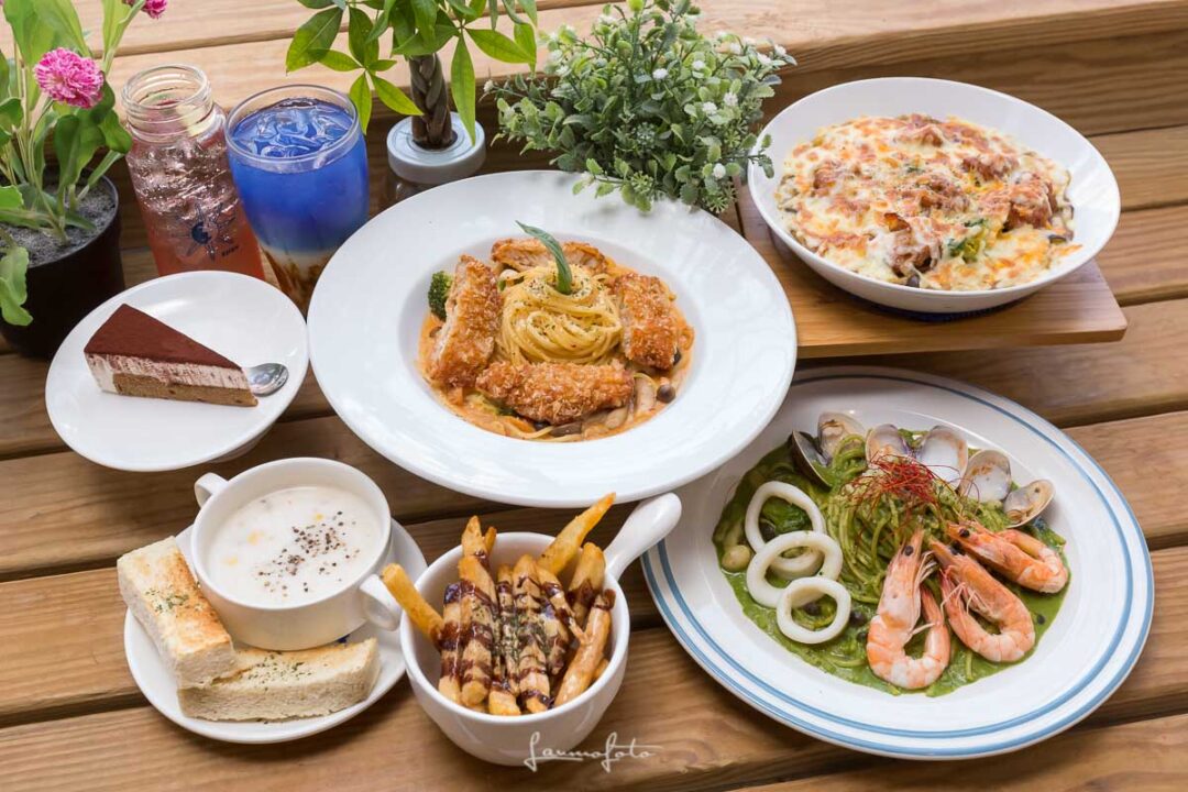 台南北區餐廳-伊甸風味館義式餐點拍攝。拍攝的餐點有奶青海鮮義大利麵、咖哩嫩雞焗烤飯以及泡菜豬排義大利麵。拍攝的飲品則有夢幻星空與紅石榴氣泡飲兩種,以及小點心花生巧克力脆薯。