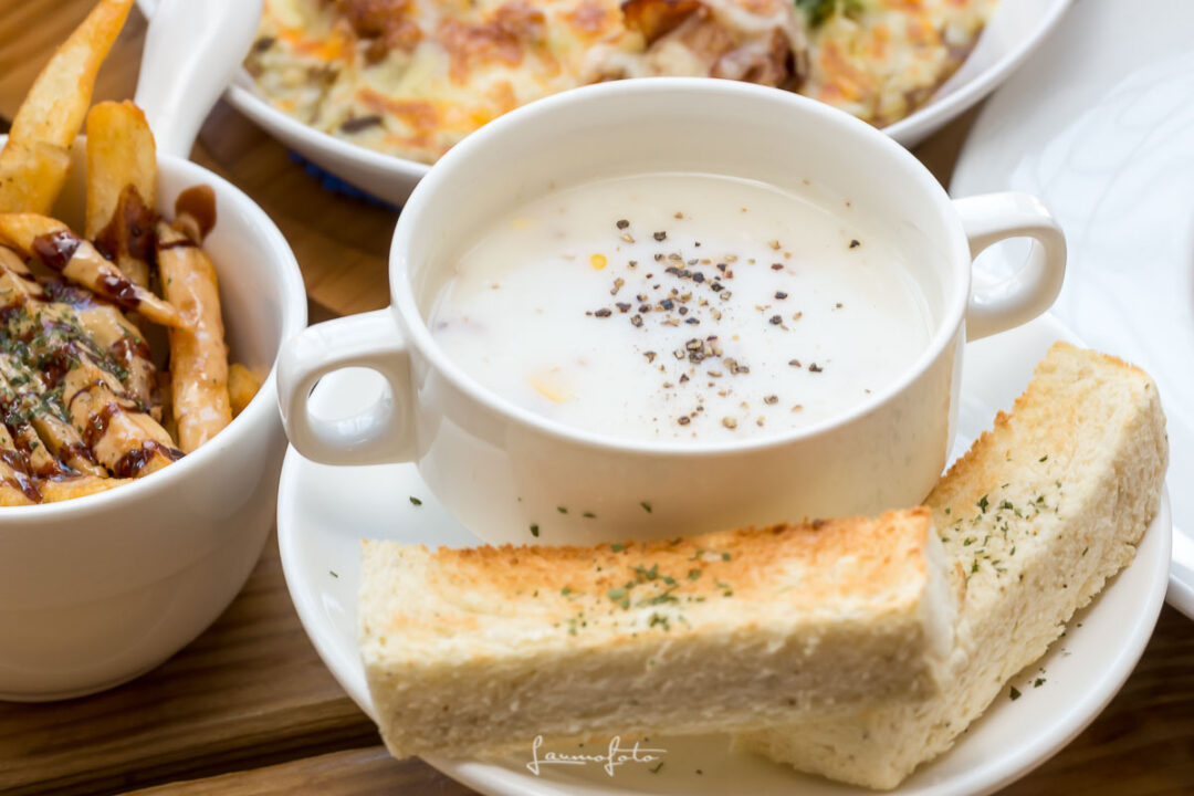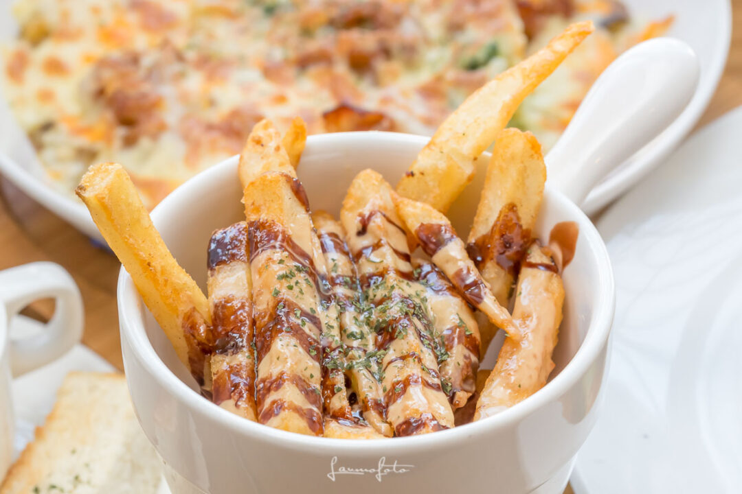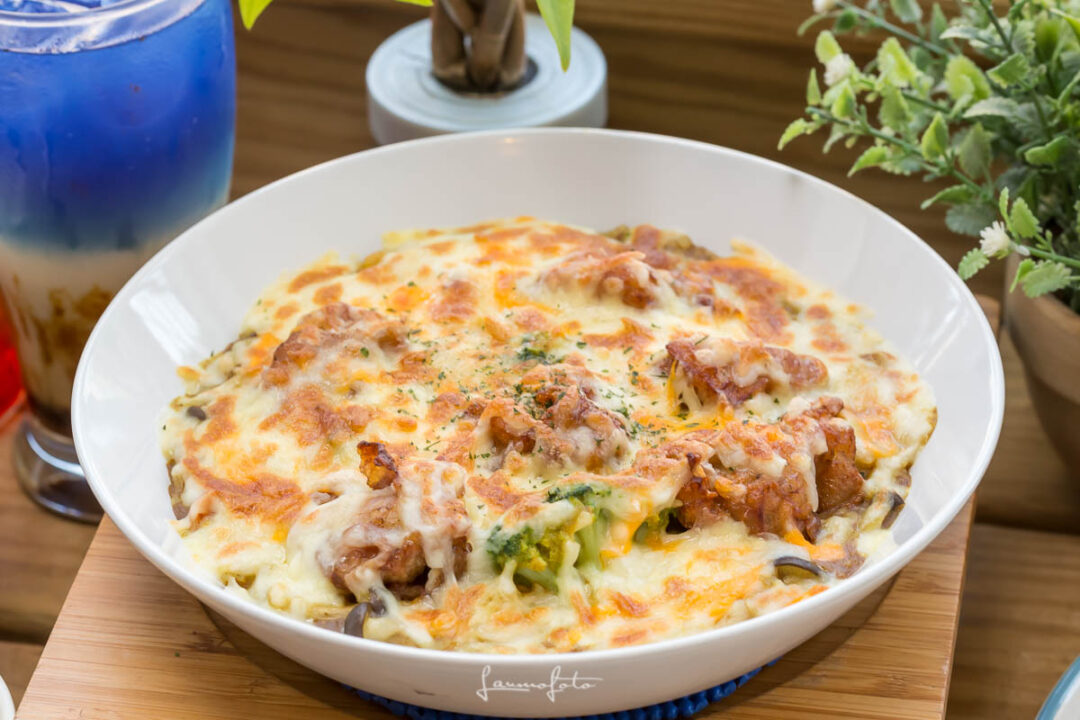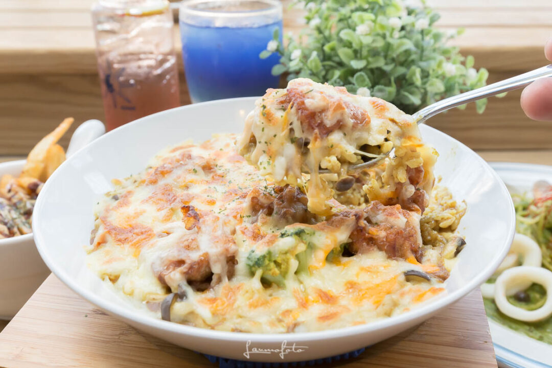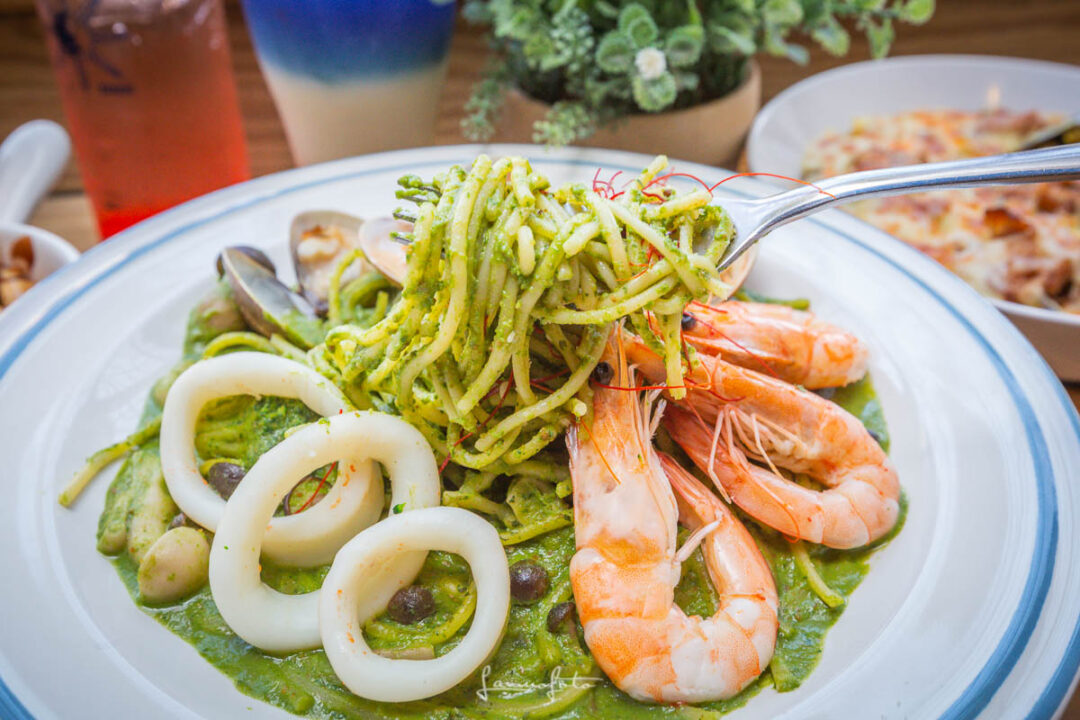 台南北區餐廳-伊甸風味館義式餐點拍攝。拍攝的餐點有奶青海鮮義大利麵、咖哩嫩雞焗烤飯以及泡菜豬排義大利麵。拍攝的飲品則有夢幻星空與紅石榴氣泡飲兩種,以及小點心花生巧克力脆薯。
