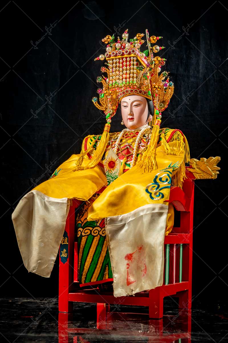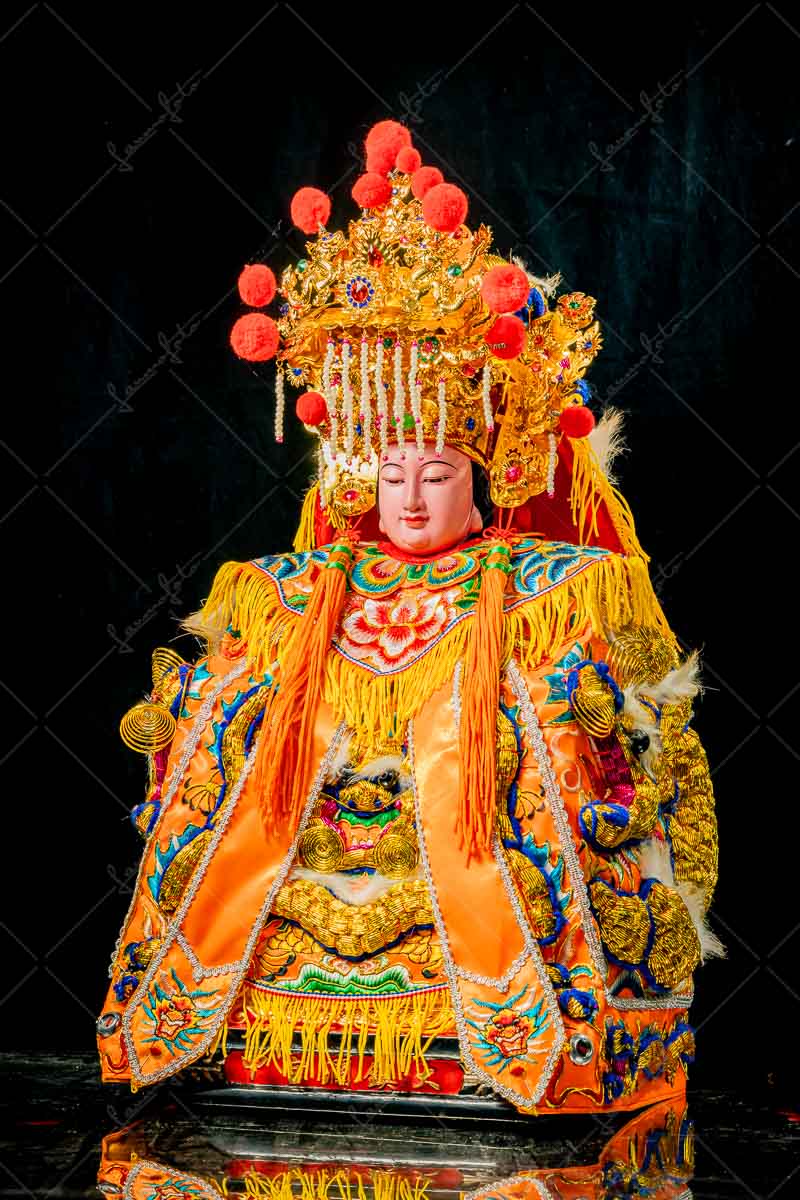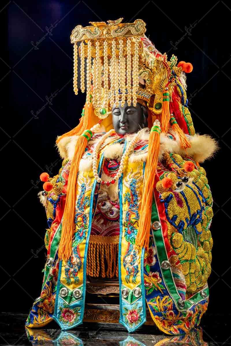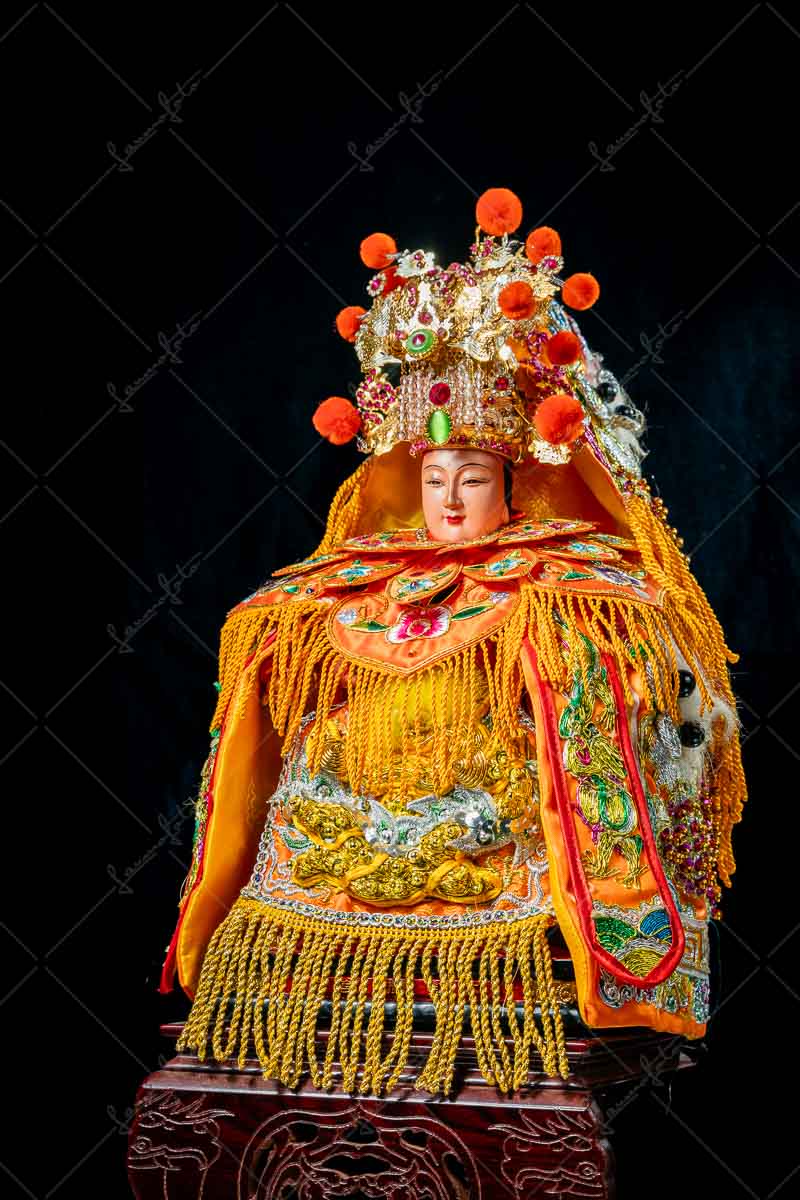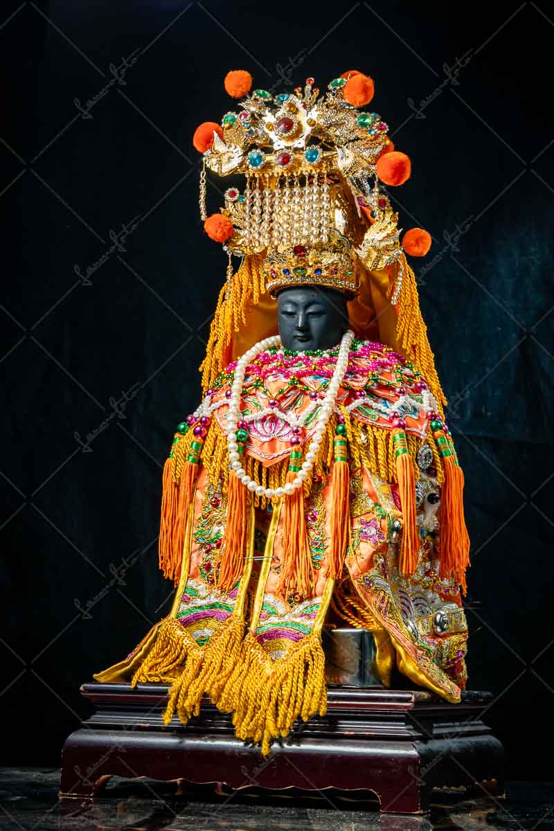 新營龍應宮**天上聖母(媽祖)**金身特寫,精緻的鳳冠珠簾與橘色繡袍細節清晰可見。