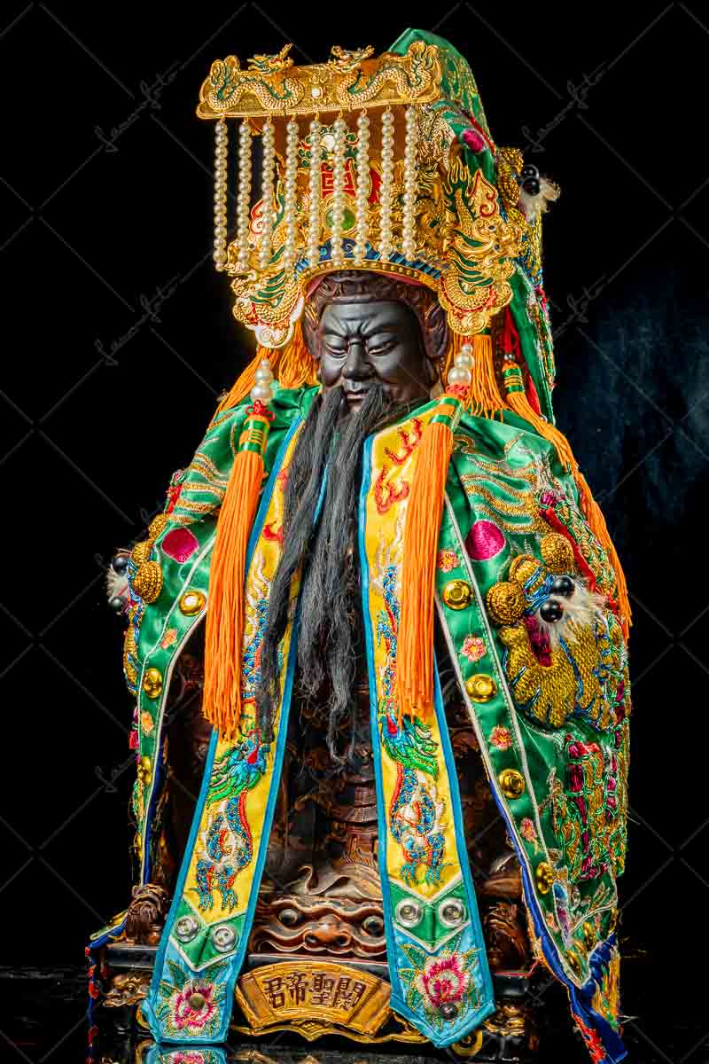 新營龍應宮關聖帝君神像寫真,身穿綠色龍袍,手撫長髯,展現威武莊嚴的法相。
